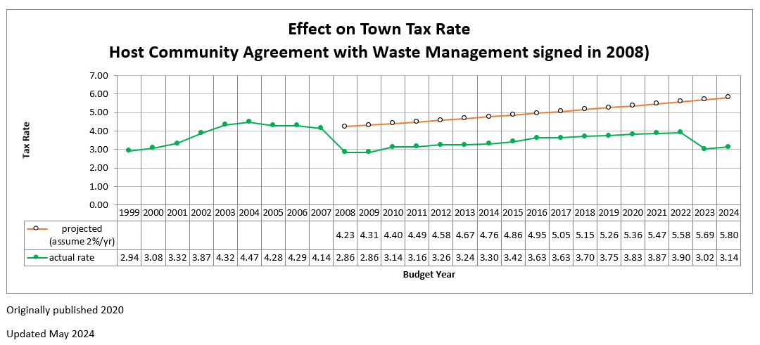 In 2020, in response to concerns about the effect of the landfill on town tax rates, we illustrated a scenario. The below graph shows the actual tax rates beginning in 1999, and what happened to them in 2008. It also shows a forecast, based on historical trends, of how the tax rate would have grown without the presence of the landfill.